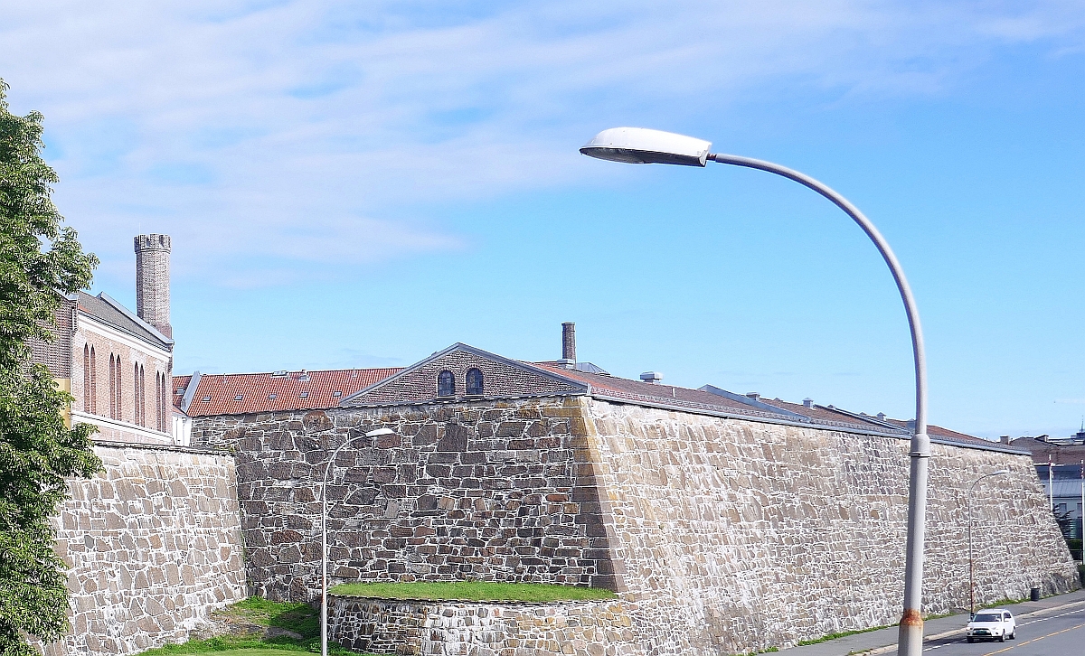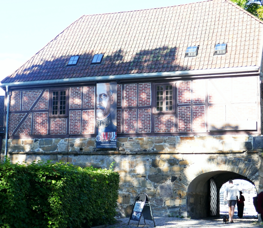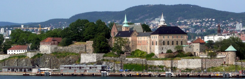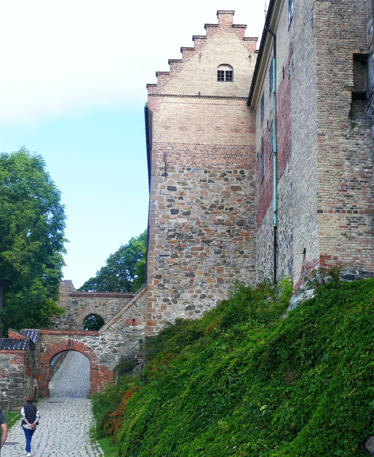 We were lucky in the placement of our hotel as it was only a short walk from one of the most interesting sites in Oslo, the medieval Akershus Fortress. It is one of the most significant castles built in the history of Denmark, constructed around 1290 by King Hakon V. Although besieged many times during the Middle Ages, it has never been taken by enemies, surviving in particular, a series of assaults during the many wars between Swedish and Norwegian forces in that period. The photo below illustrates its position on the south facing parrot-beak shaped Aker peninsula, pointing out into Oslo’s fjord. This strategic position ensured that it was the primary defence of the city of Oslo from attacks from the sea. Presumably the cannons that are placed on the embankment of the castle today were evidence of the difficulty for enemies approaching the centre of Oslo via the fjord.