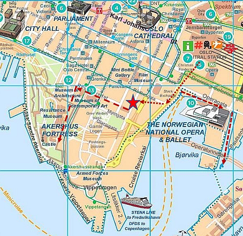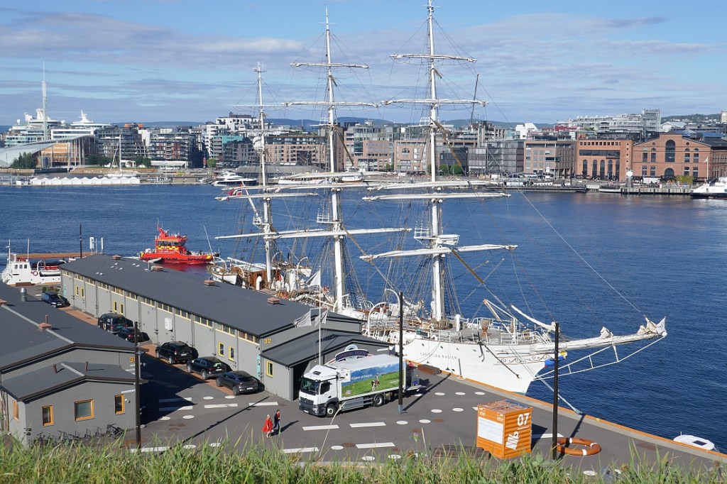 We used the tunnel under the Resistance Museum to wander down to the docks that sat below the fortress. It was a very impressive, busy harbour. Apart the huge sailing ship docked in the shadow of Akershus Fortress, we noted in the distance the slow arrival of a huge cruise ship that was slowly making its way to the central Harbour of Oslo, not far from the City’s amazing Opera House. After our time in Oslo, we sympathised with the local anti-cruise ship brigade who put up clear messages around the city that the Cruise Ship tourist trade was not welcome in town