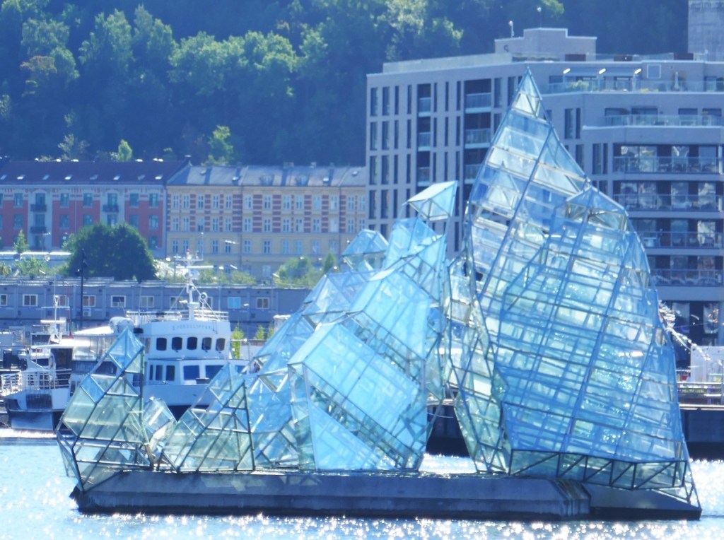My original guess as to what this sculpture was came nowhere near what the artist, Monica Bonvincini intended. It is a public, floating sculpture called ‘She Lies’ that is an interpretation of a 19th century painting by Caspar Friedrich called ‘The Sea of Ice’ (see right). Bonvincini’s sculpture floats on a concrete slab and is meant to represent a massive mound of Ice. Here is her explanation… “The synthesis of structure/skin/ornament explore the interface between nature and culture, or that of a cultural artefact. While reconstructing a famous Romantic painting, the work represents in a visual striking way the shape of an iceberg, as if one would have, by circumstances due to the global warming, ended up in the fjord in front of the opera house” When taking the long shot of the Opera House below, I should have attempted to get the angle right so that I could have got ‘She Lies’ in the frame as the sculptor clearly intends them being seen together.