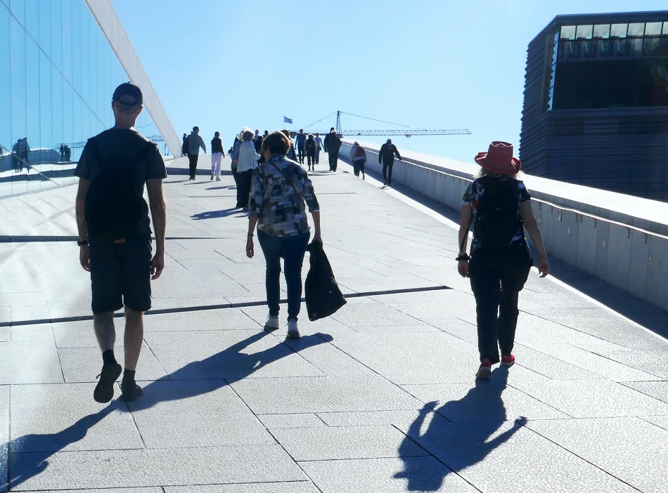 From the Fortress it was a straight walk back to the Oslofjord. We were heading to see the city’s Opera House as we had met an American couple at dinner at Vatnahalsen and when they realised we were going to Oslo the next day, they recommended we not miss the Opera House, particularly the walk on the roof! As the light was starting to fade on us when we arrived at the Oslo train station the previous day, we didn’t notice the Opera House nearby but we did notice a structure sitting in the fjord that looked to all intents and purposes like a sailing ship with glass sails.