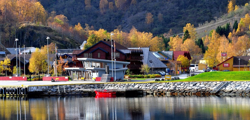The water that falls down the Kjosfossen Waterfall becomes in this valley the Flamselvi River. Apart from when the Flam train is in the tunnels, it is a close companion of the train travelling down the valley and provides much of the spectacular scenery along the way. Not far along from the village of Blomheller, the river enters rugged rocky territory and pours through a cave in the mountainside and then rushes along deep stone channels…the river almost becomes a low angle waterfall for a while until it reaches the village of Lunden. It becomes a much calmer beast as it finishes the trip to Flam where it empties into Aurlandsfjorden, a branch of Norway’s longest fjord, Sognefjorden.