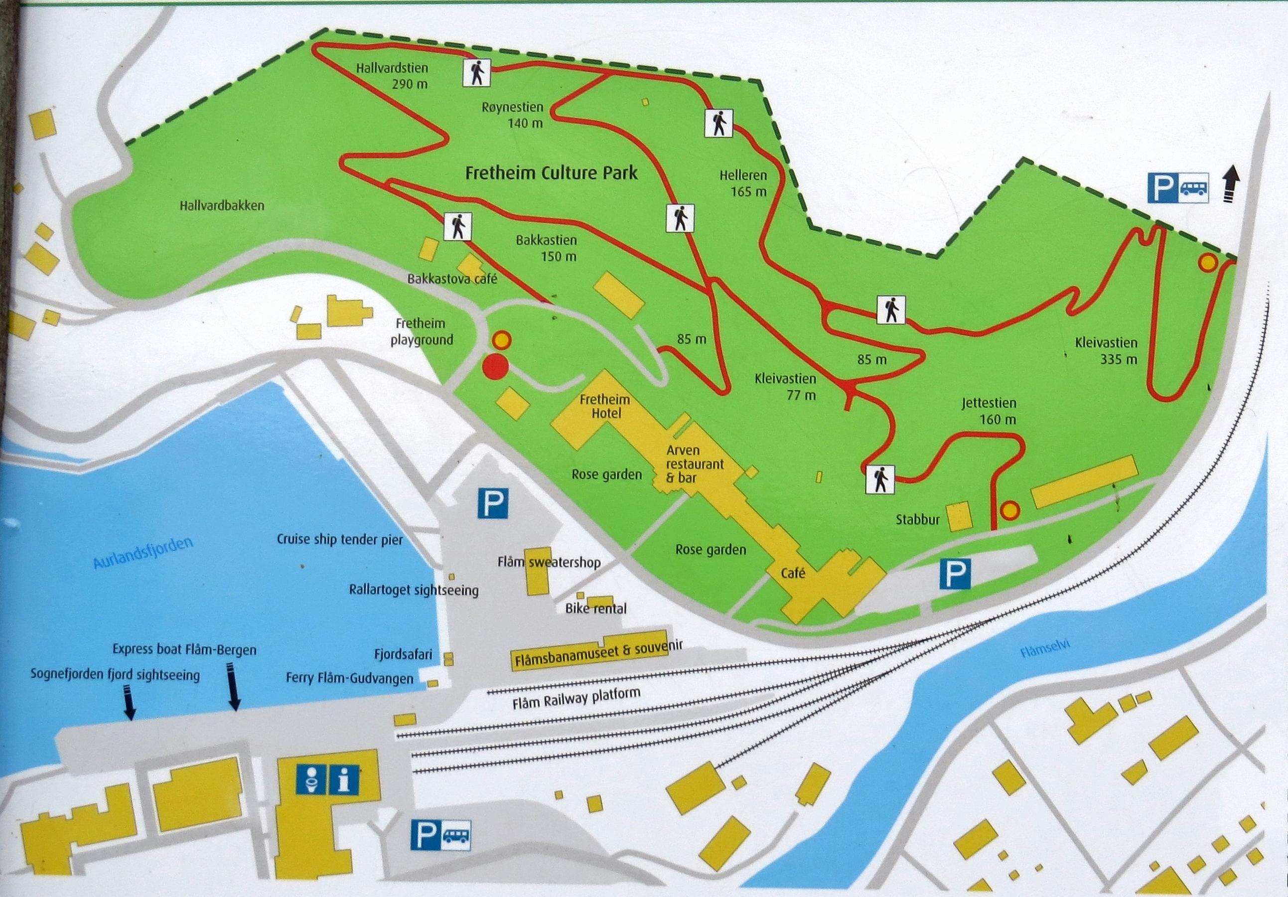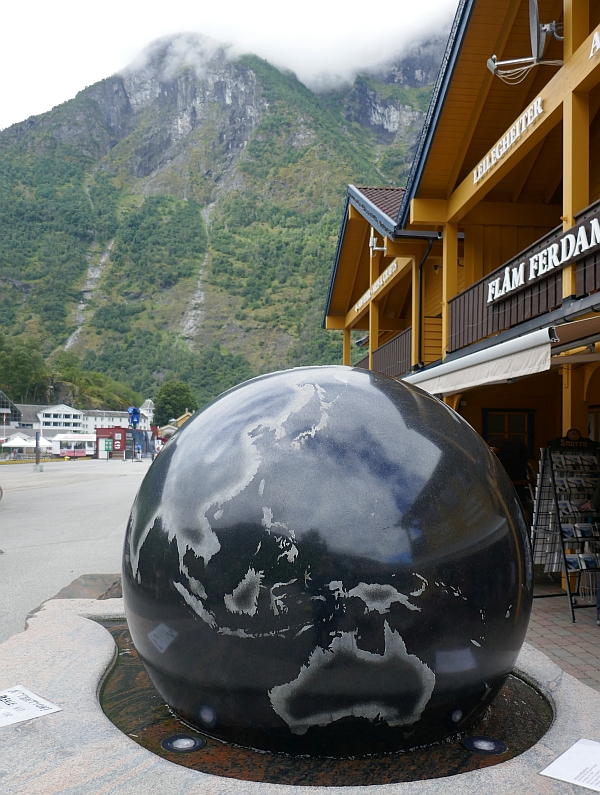 The map to the right shows that the Flam that sits at the end of the Fjord is really only a commercial, tourist site and most of the local workers would live back up the valley at places like Lunden. This area at the end of the fjord consists of a railway station, a cruise line terminal, a shopping centre, a railway museum and a ‘culture park’ that enable day visitors to take their children for a long walk between trains. We appreciated the globe map of the earth outside the shops (below left) that showed that Australia hadn’t been forgotten even though it was the other side of the world.
