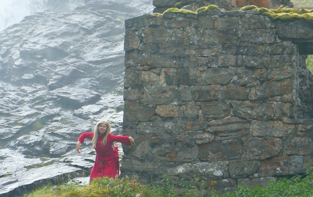 The most dramatic stop was our first stop at Kjosfossen Waterfall which has a freefall of 93 meters. Most passengers got out for the photos of the waterfall and surrounding scenery. Just to the side of the waterfall opposite the station there was the ruin of a building built completely of local rock and covered in moss. Not long after we stopped, music started to play and the sharp-eyed among us noticed a blonde-haired Nymph emerge from behind the ruin and began an alluring dance, presumably to attract the men on board to join her in her forest home. Not being up with my Norwegian folklore, I didn’t know that this was Huldra, a forest spirit, that was known even in Sami folklore. She is a beautiful creature with a few odd inhuman features such as an animal’s tail. We noticed that she could also disappear at will (behind the ruin) and suddenly appear further away on the side of a hill. Magic performance and a great start to the train ride.