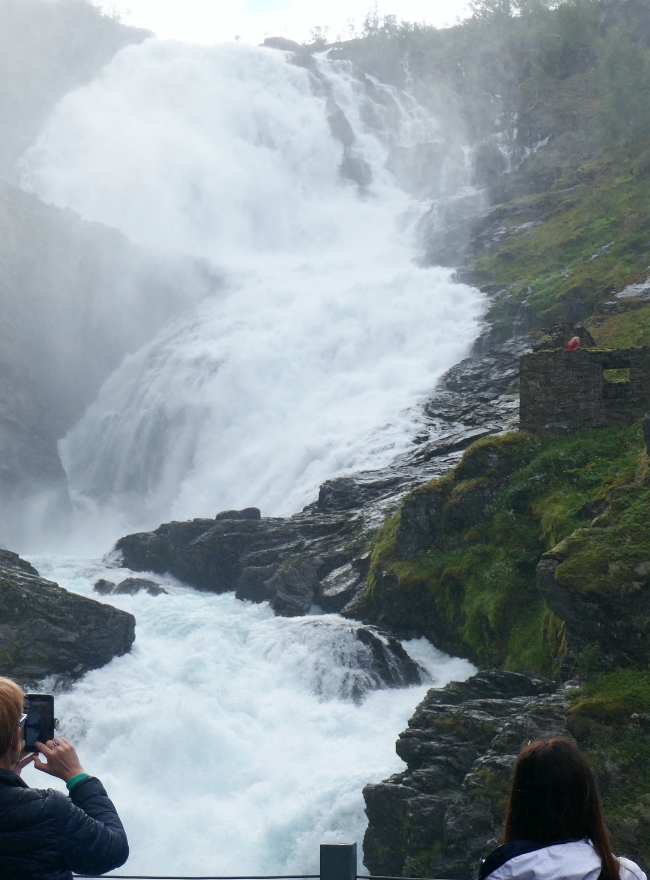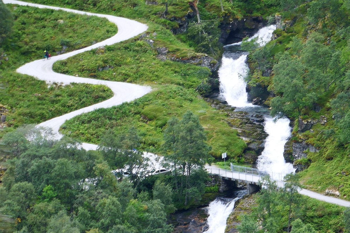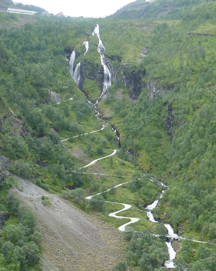 Travelling down from Myrdal to Flam can be done in a number of ways. By train is the obvious method but bike riding down the hill seemed to be another preferred method which our birthday party girls from back at Vatnahalsen were doing today. Some enthusiastic hikers even choose to walk down to Flam which takes about 5 hours. Not far on from our first waterfall stop we passed another glorious waterfall but also noticed that it was accompanied down the mountain by a fully paved bike path and sturdy bridges across the waterways. If we were to return to Vatnahalsen on a future trip, the bike ride down to Flam would be front and centre of our plans.