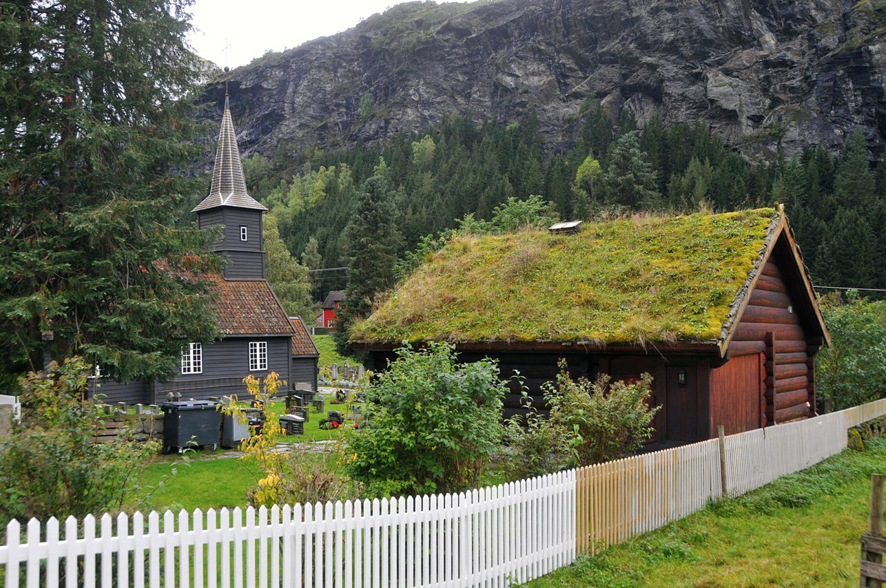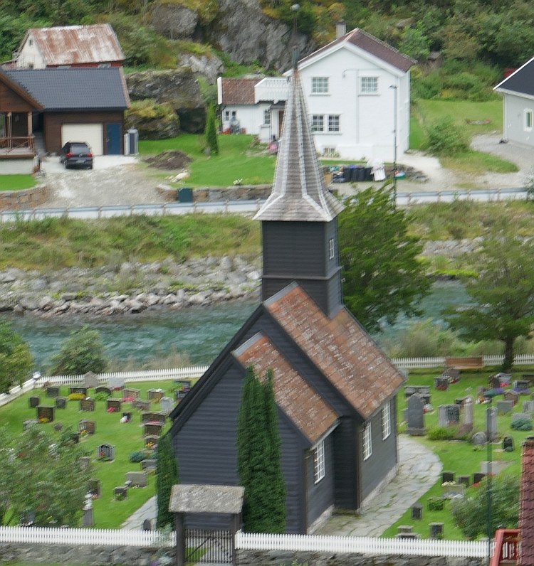 Standing out from the other buildings on this section of the trainline was an impressive looking wooden church; Flam kyrkje. There are records of a church here as long ago as 1340 but it is believed there would have been a wooden stave church on this site well before this. This church was built in 1670.This area was where the original Flam township was before commerce began to flourish in the region and the transport industries began to develop at the actual end of the fjord.