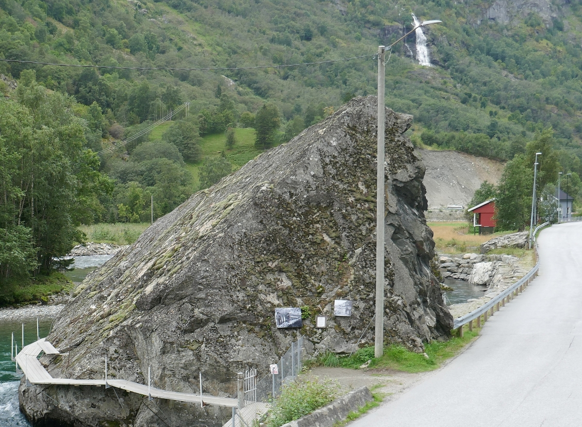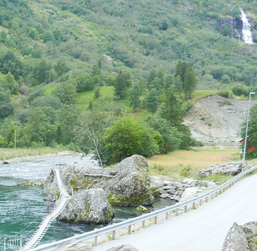 Not much further on from Lunden there appeared to be a hanging path construction built around a huge boulder that almost took up almost half the river at this point. It looked like a bit of a dare-devil course for young people to test their wits and their legs. Maybe it was part of an obstacle course that visitors to Flam completed after their bike ride down the valley.