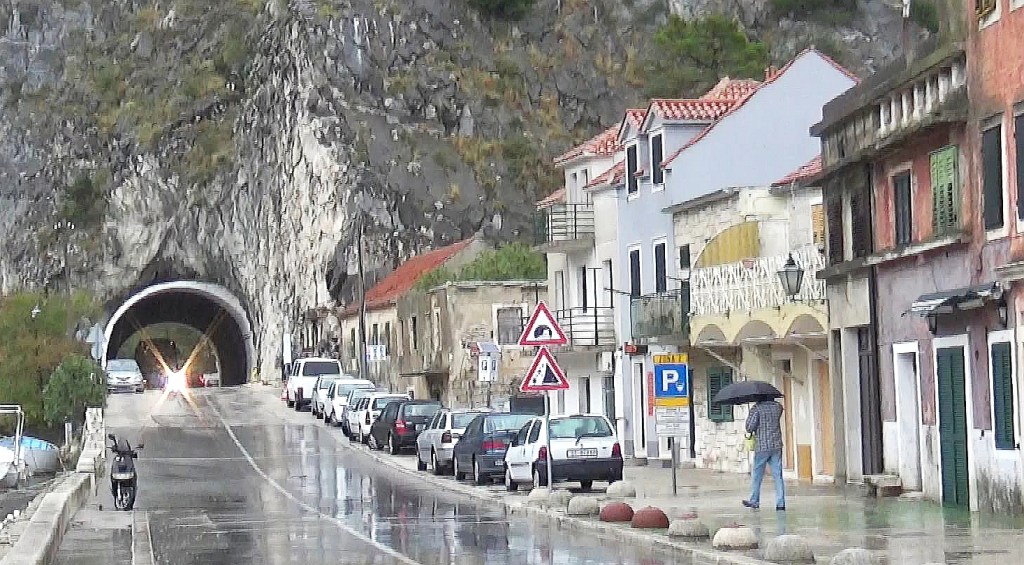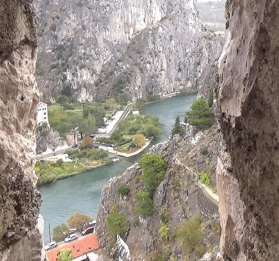 We only had a couple of hours to walk around Omis before we were due back at the boat. We found ourselves on the roadway that ran along beside the river and we were pleased to note that modern citizens of Omis didn’t have to use a boat or climb a mountain in order to get into the interior of Dalmatia: they could just drive their car through a tunnel in the mountain. The last photo below is an aerial shot that gives a clear view of the river valleys that dominate the other side of local peaks.