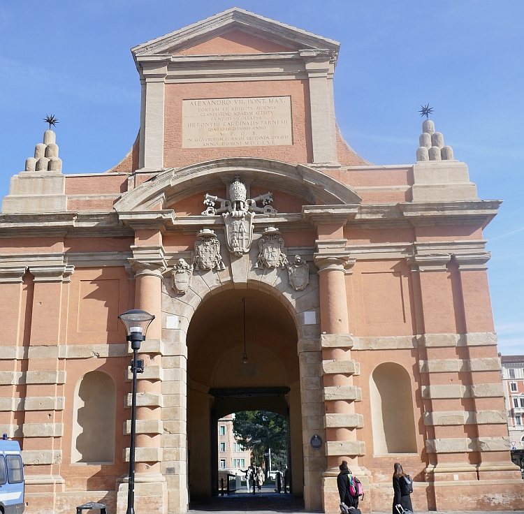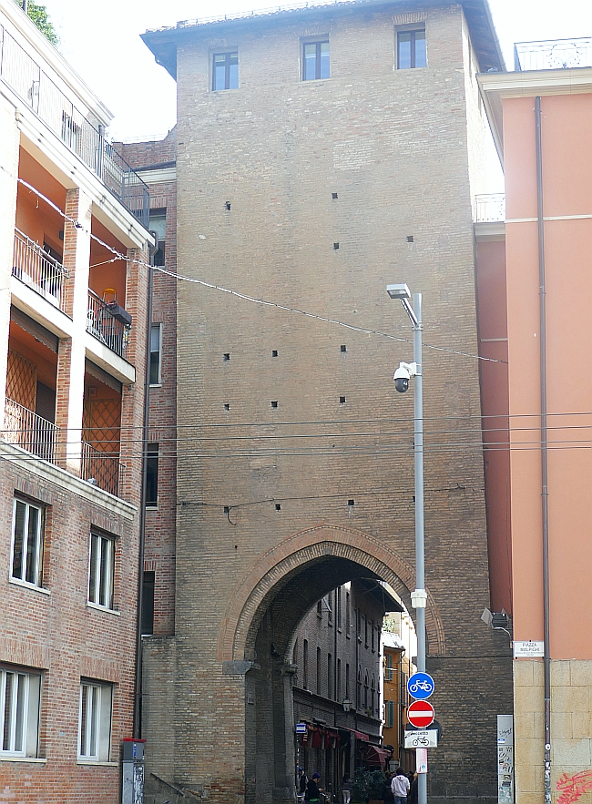 Bologna has a well-preserved historical centre where its medieval walls have disappeared but the city gates of these walls have been preserved. Like my visit to Padua a few days earlier, I did not have a good map of the city when I arrived but I was able get my direction for the morning organised when I asked a policeman in front of the train station what the best route was to get to the old centre of the city. He immediately pointed me over the road to the start of Via dell’ Independenza which would take me directly to my destination, Piazza Maggiore. Next to the start of this main road was my first city gate of the morning, Porta Galleria. Like so many other cities in this region, Bologna was proud of its achievement of independence in the 19th century so the piazza around the gate was called Piazza XX Settembre. Porta Galleria was built initially in the 13th century when Bologna was ruled from Rome; nearby was the Castello di Gallieria which was destroyed by local citizens in 1334 who were rebelling against the control of the Papal States. Brick ruins of this ancient Castello (right below) are still standing over the road from Porta Galliera. The city gate however still held its Papal insignia in the archway over the gate.