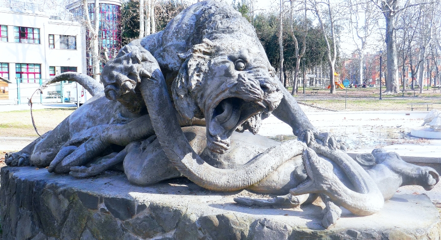 At the start of my walk there was a large area devoted to ponds that had large sculptures. The first one I encountered displayed a brawl between a large lion and a huge snake, an image that must have caused nightmares to the small children passing by. The map above shows the outline of this park and I took the central pathway that led to the next major sculptural piece.