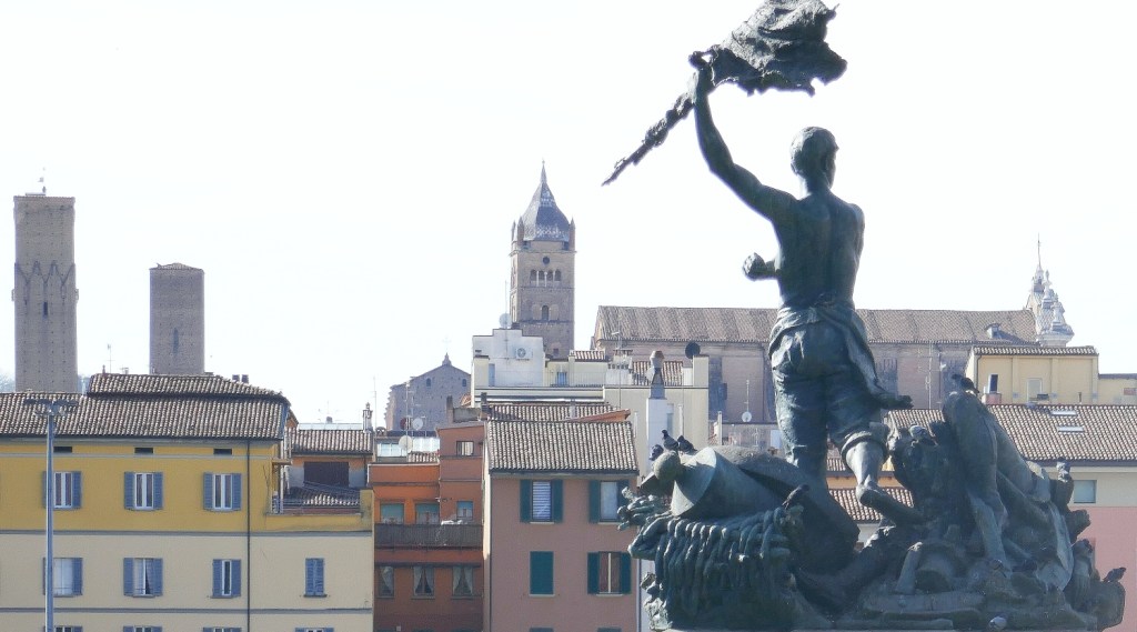 I presumed the sculptural image shown below must be some celebration of Italian independence but my grasp of Italian on the base of the work did not enlighten me. However the view from the park from behind the statue gave me a panorama of what to expect on my walk down to the centre of town. On the right of the photo can be seen the Metropolitan Cathedral of St Pietro with its separate bell tower at the back of this huge church. Beside the bell tower but further along at the back of Piazza Magiorre is the Basilica di San Pietro. Further to the left are the two towers, Garisenda and Asinelli which are usually considered as the symbols of Bologna.