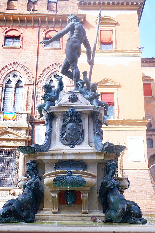 From the Cathedral it was only a short walk up to Piazza del Nettuno, named after the huge statue and fountain of Neptune towards the upper edge of this piazza. The sculptor (Giambologna) had origially intended to make Neptune’s private parts larger but was forbidden by church representatives. Apparently from a certain angle, the thumb of the left hand takes on a different aspect. The statue was at one stage fitted with bronze pants due to the swooning of passing ladies. (Info courtesy of blog ‘Bologna on Foot’). Right on the corner of this square was a Tourist Office so I was able to get a great map of the city.