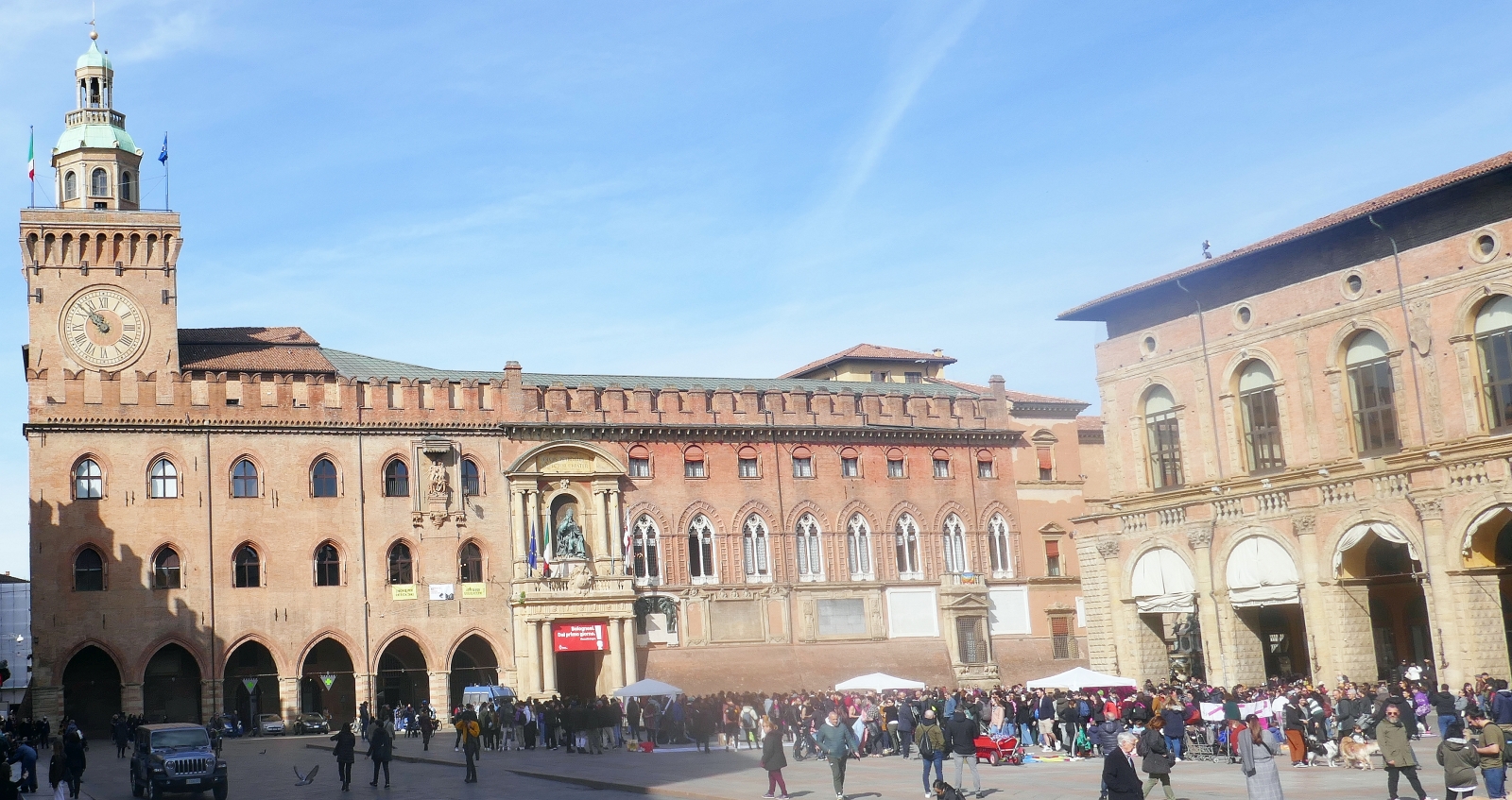 Further along past the Fountain of Neptune, I officially entered the Piazza Maggiore but I discovered I had arrived on a busy day, not because of the number of tourists but by a large crowd of young University students. The photo above right of the main piazza shows this crowd in front of Palazzo del Podesta (a building linked to the local government), lining up to sign a petition; my best guess was that it had something to do with the situation of a Coptic Egyptian postgraduate of Bologna University who was meant to be going on trial for his work on human rights in Egypt.
