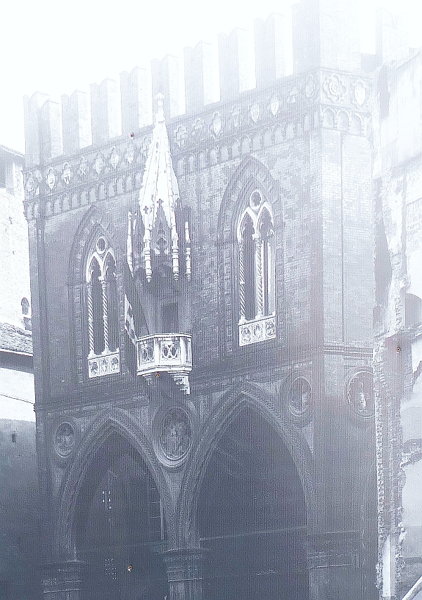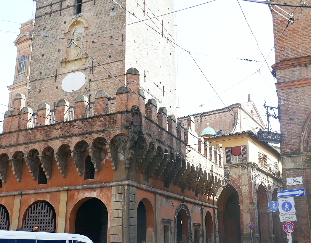 My walk took me back to Piazza Maggiore, across the square, still crowded with students signing petitions. You can’t go far in Bologna without passing another church. Not far from Piazza Maggiore there is Santa Maria della Vita (17th C), squeezed in between some “non-churches”. I found my way to Via Constiglione where I was able to turn left which led me down to Piazza della Mercanzia. The key building in this square is a very ancient building (late 14th C.), Palazzo della Mercanzia, that is the Chamber of Commerce today. (Centre photo below). In the area there were some building hoardings that were being used to show old photos of the area such as the damage to this Palazzo when a bombing raid in 1943 destroyed parts of the building.