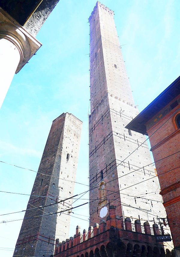 From Piazza della Mercanzia it is a short but crowded walk to the corner of Via Rizzolo where apart from the car drivers, most people are looking up at the two towers, the symbols of Bologna. The taller one is called the Asinelli and the smaller, more ‘leaning’ tower is called the Garisendi. It is believed that these names refer to the original families who constructed the towers sometime between 1109 and 1119. The Asinelli tower is believed to have been original constructed at 70 metres tall and then raised later to the height of 97.2 metres with an overhanging battlement. It became council property in the 14th century and was used as a prison. Towers this tall are targets to lightning strikes but a lightning rod wasn’ty installed until 1824. As late as World War 2, this tower was used by volunteers tyo direct rescue operations during and after bombing attacks by Allied planes. It was the tallest building in the world up until 1197 when this title was handed over to Lincoln Cathedral.