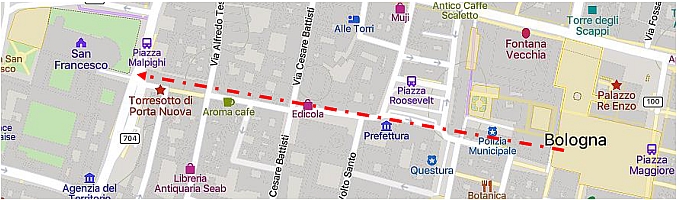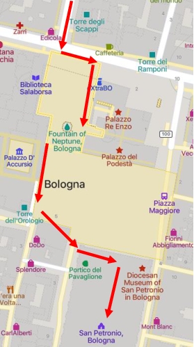 The last destination of my time in Bologna was a site on the other side of the city, not quite all the way to Porta San Vitale which was the gate in the walls on the west side of Bologna. I was intent on having a close up look at two of the famous towers of Bologna that I had seen from a distance in the Park of Montagnola at the start of my morning walk through Bologna. In appendix 1 there is a picture of the towers of Bologna in the Middle Ages and there appears to be huge number; one estimate is up to 180 towers. The two most famous today are the Asinelli Tower and the Garisenda Tower. In the image on the right above, the smaller tower is the Garisenda Tower that has a lean on it that is very similar to the Famous leaning tower of Pisa.
