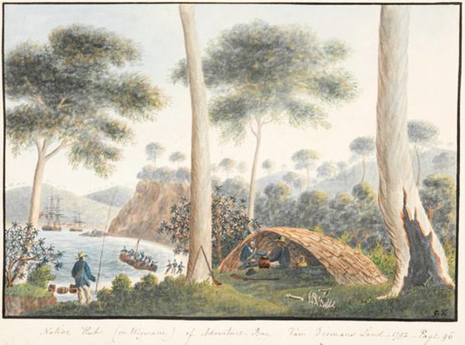 APPENDIX 2: Another water-colour by Naval Lieutenant George Tobin of Adventure Bay, this time with an image of a dwelling of the original inhabitants.