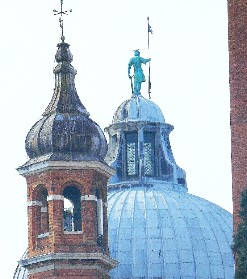 The interior of the church of San Giorgio Maggiore was a pleasure to visit. If you are a fan of Tintoretto, the great 16th century artist, there are a number of paintings of his to inspect inside this church. I was particularly intrigued by the unusual bronze statue group that stood above the high altar of the church (above right). The subject of the piece is the Trinity and the four gospel writers supporting a large copper globe upon which stood the sculptor’s (Girolamo Campagna) version of God the father.