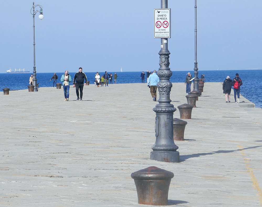 Rather than being distracted by the impressive buildings that lined the seafront of Trieste, I continued along the pathway that led along the foreshore of the city. The first site of local importance that I came upon was the Molo Audace which was a long pier that stretched out into the Adriatic, just over the road from the central piazza of the city, the Piazza Unita d’Italia. The pier was built over a shipwreck back in the 1740s and for two centuries, passenger and merchant ships docked here. The first ship to enter the port at the end of WW 1 was an Italian Navy ship Audace and so the pier received its current name, Molo Audace. It is a popular place for promenading by the locals and there were a lot of people out for a morning walk when I strolled out to investigate the Molo.