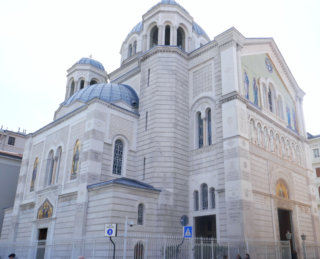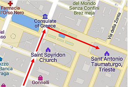 I walked up two blocks on Corso Italia and then turned left onto Via S.Spiridione, which led me up to the end of the Canal Grande di Trieste (Image below left). On the corner of Via S.Spiridione stands a simply beautiful Orthodox church with large areas of ornate mosaics on the walls. It is apparently the first Orthodox Church built in Trieste. It was originally shared between Greek and Serbian Communities but the two groups built their separate churches in the 19th century. Translated, this church’s official name is the Serbian Orthodox Church of San Spiridione.