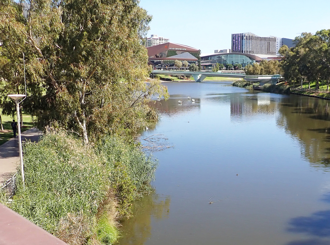 Below left shows the view looking towards Adelaide Bridge from the bank of the River Torrens opposite the Adelaide oval. We decided to linger on this bridge to take in the views back along the river towards the Convention Centre