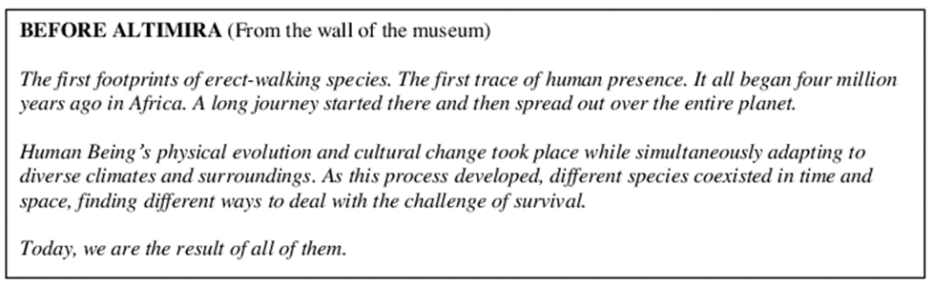 The structure of the museum at Altimira had been thought through carefully. On entering the museum the visitors are given a crash course in Anthropology, particularly key information about the different species of humanity that wandered out of Africa millions of years ago. The main four species were well illustrated. In the images below, the oldest species of ‘Homo’ on the left (Homo Habilis) emerged from southern and eastern Africa in the period spanning 2.1 to 1.44 million years ago. The second image is of Homo Heidelbergensis which was the species that populated Europe between 600,000-200,000 years ago. Then came the third species, Homo Neanderthalensis who emerged in Europe and the Near East between 250,000 and 28,000 years ago. The fourth species were the anatomically modern humans who appeared in Africa 300,000 years ago and reached Europe 40,000 years ago. The arrival of Homo Sapiens is thought to have decimated the Neanderthals who disappeared around 12,000 years ago.