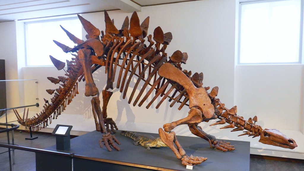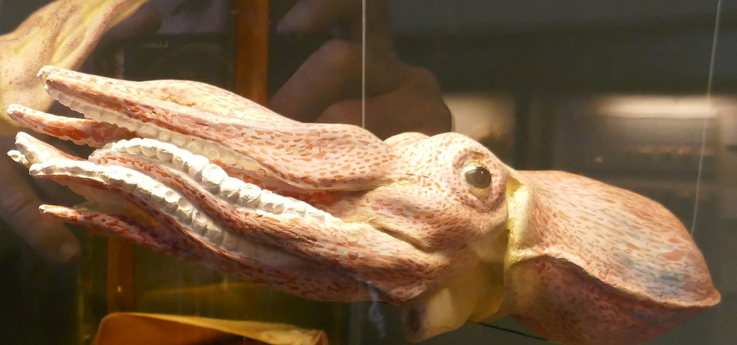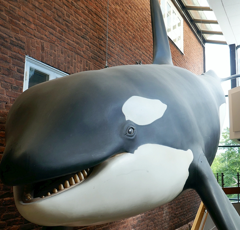 Even before we entered this museum, its range of exhibits were suggested by items outside the front door; there were two large rocks that were the first geological displays of the visit plus the back half of a plunging whale on the awning over the entrance began the displays on marine life. We didn’t get far inside before we encountered another huge whale balancing above our heads on the first set of stairs. Entry to this museum was free!