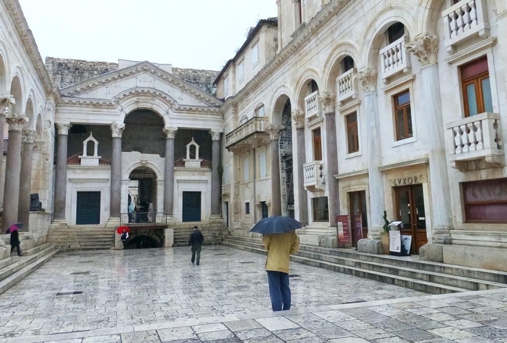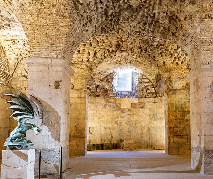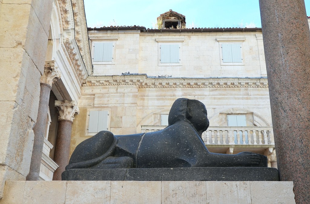 Apart from being a beautiful area in itself, the Peristyle is the entry point to the key areas of the palace. However there is one highly significant item that sits in this square and can be just seen on the left of the photo below at the far end of this paved area. It is a black granite sphinx that once belonged to King Thutmose, famous ruler of Egypt in the 16th century BCE. In preparing his retirement palace, Diocletian was acutely aware that it would also be his mausoleum and so he gathered (collected, stole?) between 8-12 sphinxes from Egypt to be the holy guardians of his tomb. The one still standing guard in Split today is the only one to have survived intact. When the palace was taken over by Christian refugees in the 7th century, old memories of Diocletian’s actions against their ancestors returned and so the heads of many of these sphinxes were cut off and disposed of. This last surviving trophy of Diocletian is today well over 3000 years old and possibly one of the oldest objects to be found in Split.