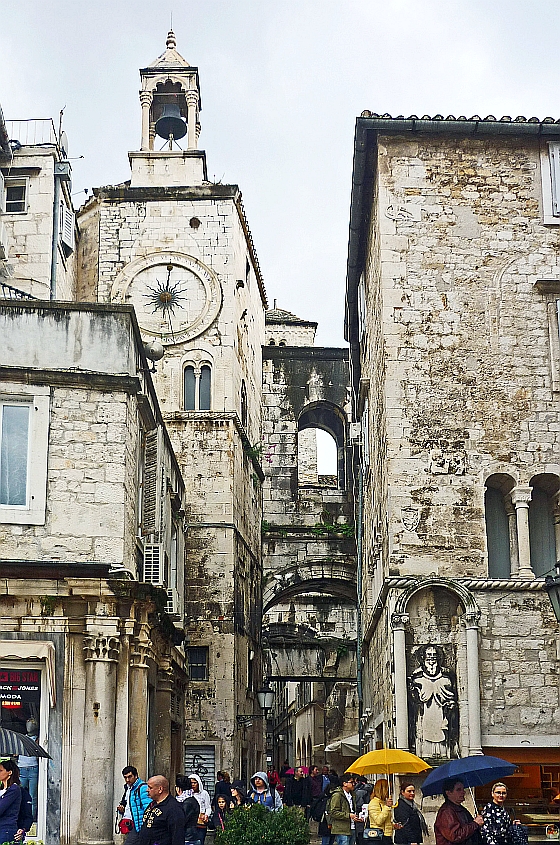 When finished with examining the Temple to Jupiter, the visitor can walk back through the peristyle and out into the main ‘street’ of the Diocletian Palace that runs through the centre from East to West. It is called the Decumanus and when we there it was a very busy street with shoppers and tourists exploring the Palace. The Western or Iron Gate can be seen on the left below. The eastern or Silver Gate is on the right below.