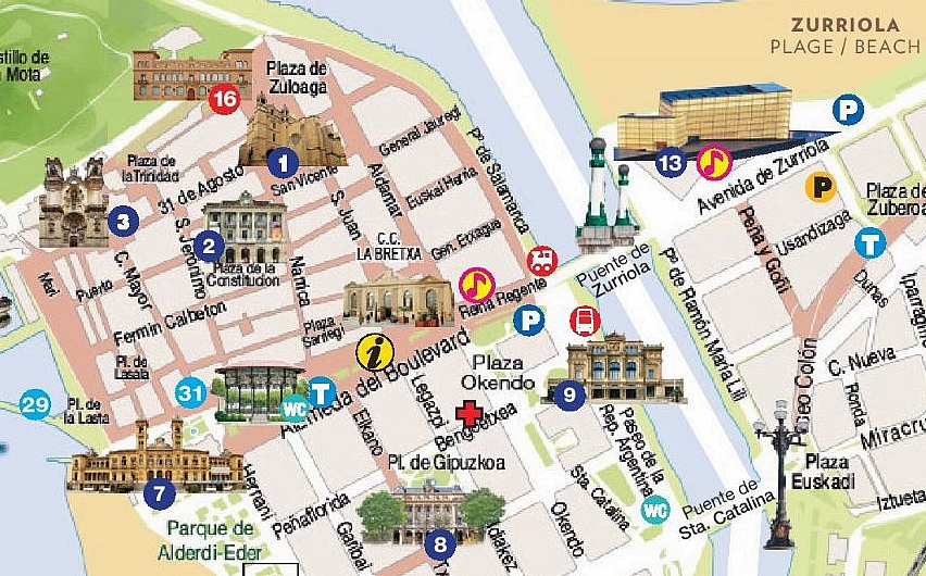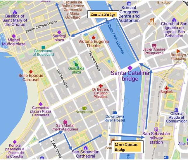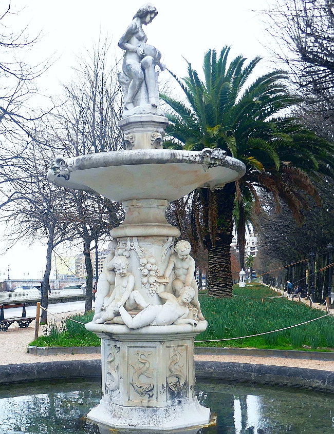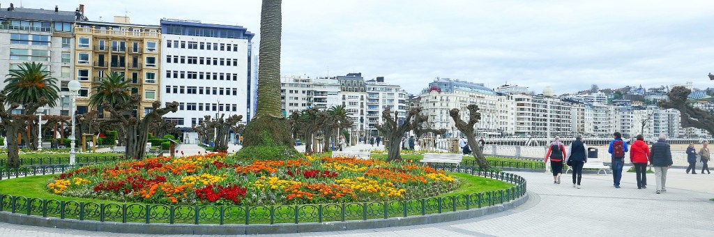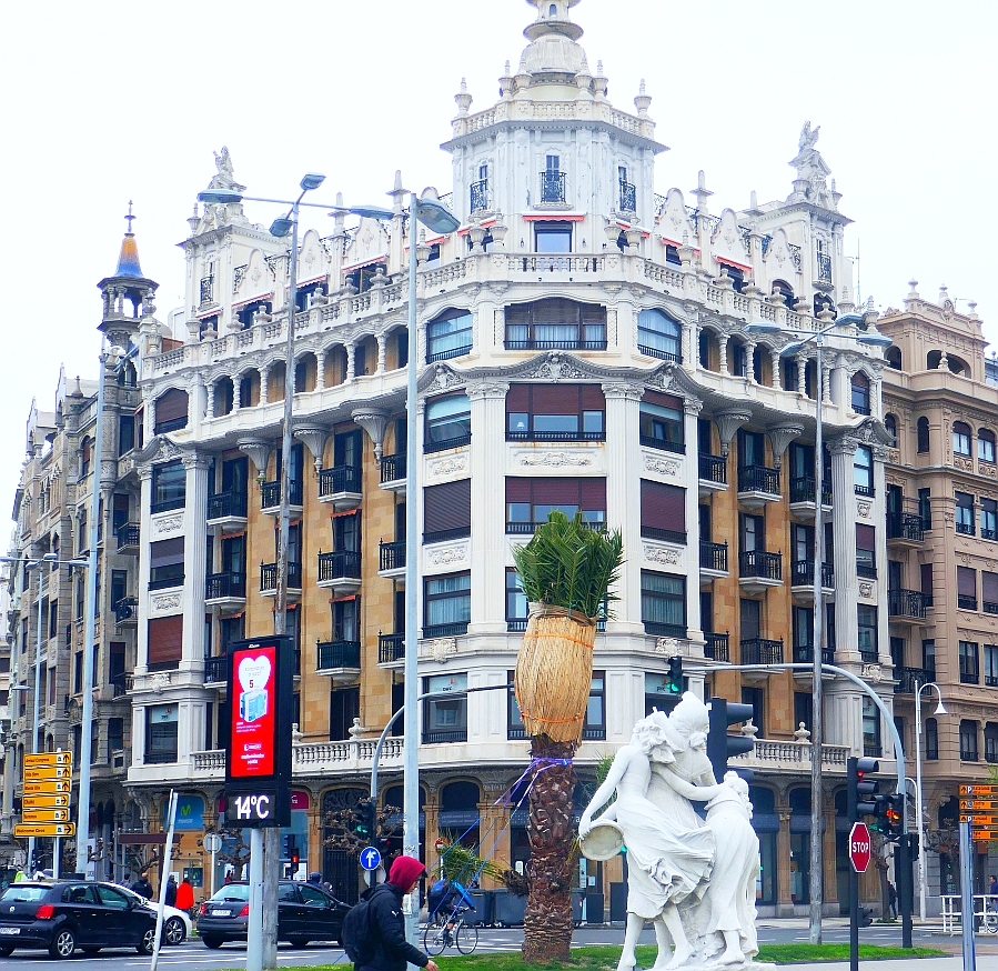 We crossed over the Maria Cristina bridge and turned left in the direction of the sea. It was a gorgeous morning walk as we strolled past the gardens that lined the river walk. The next bridge down was the Santa Catalina Bridge and we passed through the Euskadi Plaza that covered both sides of the road that approached from this bridge. Note the Dancing Ladies (esculturas danzarinas) next to the palm tree below right in this plaza.