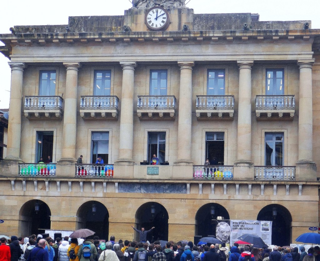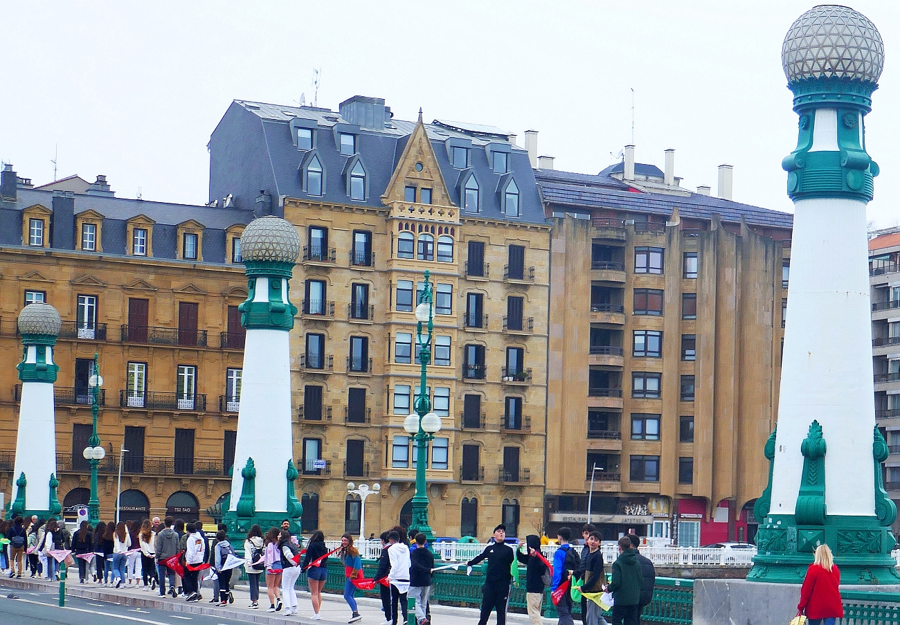 By this stage of our walk we were becoming aware of the large numbers of school students that seemed to be having the day off, particularly after we reached Paseo de Jesus Maria de Laezada across from the impressive Kursaal Conference Centre (See left below). Eventually we decided to ask one of the students sitting near us as to why such a crowd of students had the day off school. Their English wasn’t fantastic but we gathered they had been called to protest against some governmental change to the process of teaching the Basque Language. Their catch cry appeared to be something like, “Keep your hands off our Basque Language!” The image on the right below was taken when the students were gathered to march over the Zurriola Bridge.