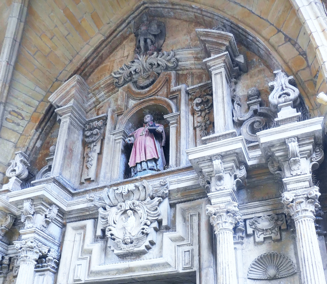 In the image to left below, part of Monte Urgull looms above the apartment blocks beside the river but its most important monument, El Sagrado Corazon (Sacred Heart), can be clearly seen. It has been referred to as the custodian of the city since 1950. With another day on our hands to see more of San Sebastian, I would have loved to have explored this mountain. The other flying object to the right in this photo is not a kite but a large seagull “blowin in the wind”. The image on the right is the doorway of the church of St Vincent the Martyr and is the oldest building in San Sebastian. It was our target after we had had inspected Plaza de la Constitution.