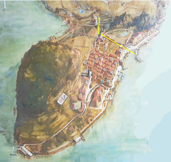 We were staying at Motel Belvedere which wasn’t located in the old town area of Bellagio but up on the ‘saddle’ of the promontory with views in both directions of Lake Como. We were collected by the hotel van and the map to the right shows our location for the next three nights. The photo below shows Hotel Belvedere’s position which enabled us to walk one way along a direct path to explore the old town from the upper side or walk the other way down to the amazing landscaped villa gardens along the water’s edge of lake Como.