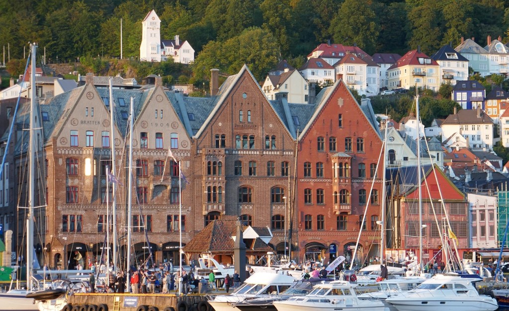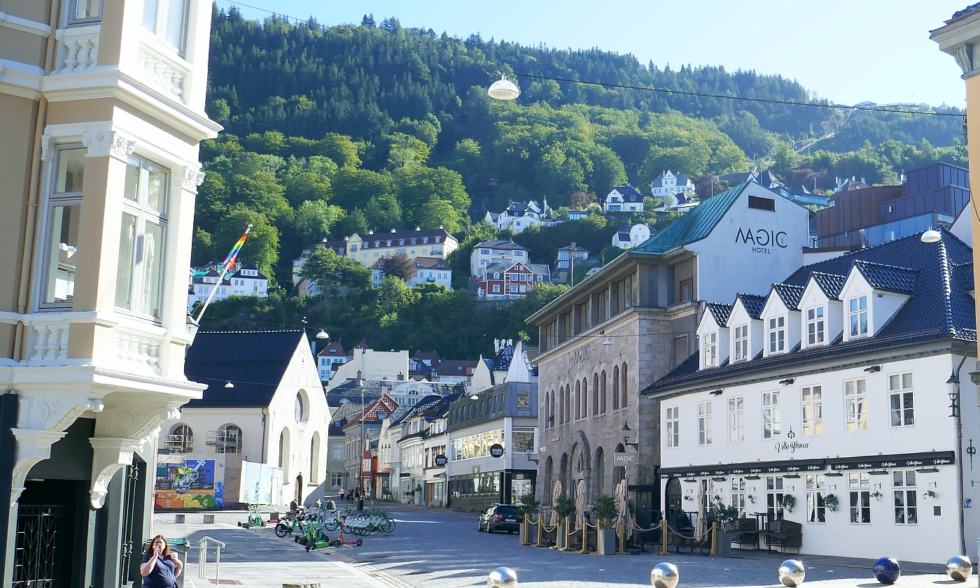 We had a rest in the park around this lake, enjoying the sunshine and the lake’s fountain before continuing our tour of Bergen. The view shown in the image below is of the buildings on the left-hand side of Lille Lungegardsvannet; there are five main buildings here and they are all institutions showcasing the art of Norway. The first gallery, KODE 4 is a general art museum with an attached Michelin Star restaurant. The second building is KODE 3 and is an Art Gallery. The third building is the Bergen Kunsthall specialising in modern Art. The fourth and last building houses the West Norway Museum of decorative Art. There was a lot of art on display on this side of the lake but alas we had plenty more places to visit this morning as well as find coffee and cake to fuel us for the rest of the journey, much of it up hill and down dale.