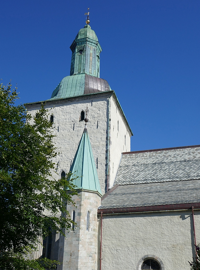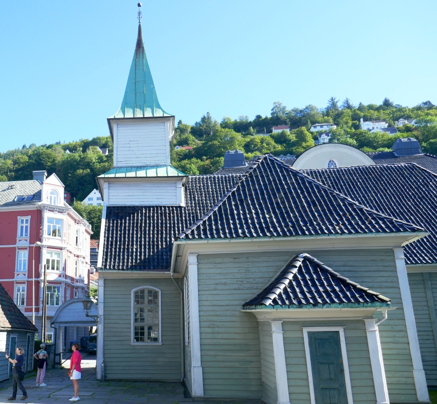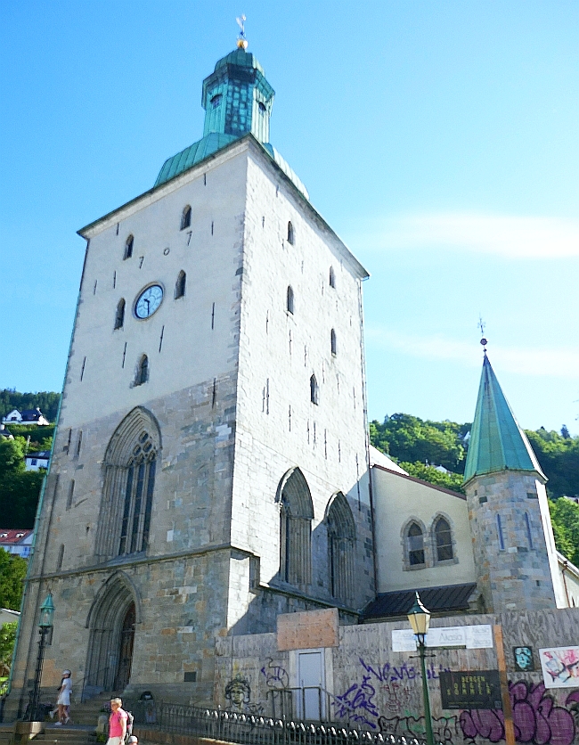 The streets led us on towards the foot of Mt Floyen where we turned the corner and found ourselves outside the Bergen ‘domkirke’, the city’s cathedral. It was originally dedicated to St Olaf (a King of Norway) and the first reference to the church was in a saga in 1181 when warriors took shelter in this church, then called Olavskirken. Like so many local churches, the original building was burnt down in 1248 as part of a city-wide fire. Rebuilt, it burned down again and was not reconstructed until the 1550s. Being nominated as the city cathedral in the 16th century didn’t stop this church being damaged again by fires in 1623 and 1640. It received its final reset after these fires and took on today’s appearance. We were able to have a look inside Bergen’s austere cathedral and were very impressed by its sparse but beautiful images and furniture. We also discovered it was famous for its organ music and its first organ was dated to 1549.