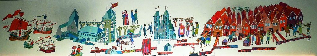 By now our walk had taken us to the part of town just above the city’s main railway station where we had arrived after lunch on Saturday. We turned right and headed down hill and decided to walk through the station’s main building as we hadn’t had much time or interest yesterday to have a good look at it. I admired the mural over the main exit that gave the visitor a potted summary of the history of Bergen and its main monuments.