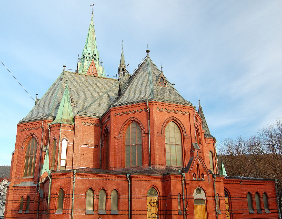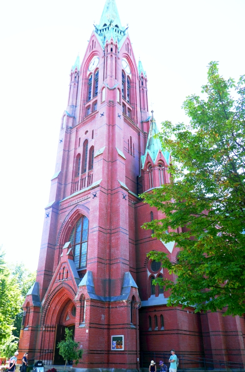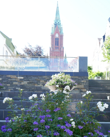 We found a lovely café on the corner of Lars Hill Gate and Vestre Torggaten which was convenient for us because we could see our next destination up the hill at the top of this street; Johanneskirken (St John’s Church). One of the curious aspects of travel is that you often strike up accidental conversations with people you meet in cafes like the one we sat ourselves down in its outdoor chairs. There was an Iranian man enjoying his coffee here and he was very happy to chat to us about his life and job in Norway and his perceptions of Norwegians in general.