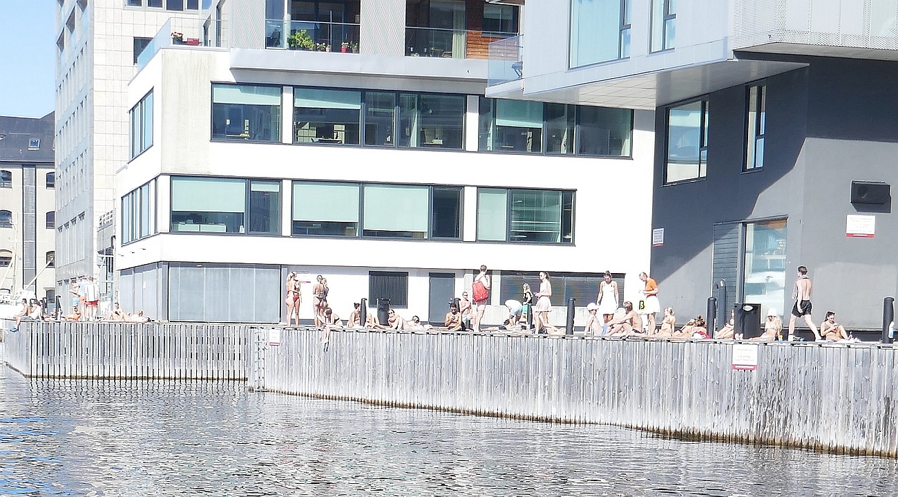 We made it down the hill to the dock area and found the sign pointing to the Hurtigruten dock. On the way we passed some curious images. One was a cartoon of an elongated dog tied in a knot and unaware of his connection with a ghastly claw from another dimension. The other curiosity was that the harbour in this area appeared to be treated by the youth of the city (perhaps the Uni students) as the town beach. Not far from where the big ships were docked, a long area beside the harbour had been taken over by scantily dressed youth who appeared to have no concerns about any pollution that might have escaped the ships and spoilt their local swimming spot.