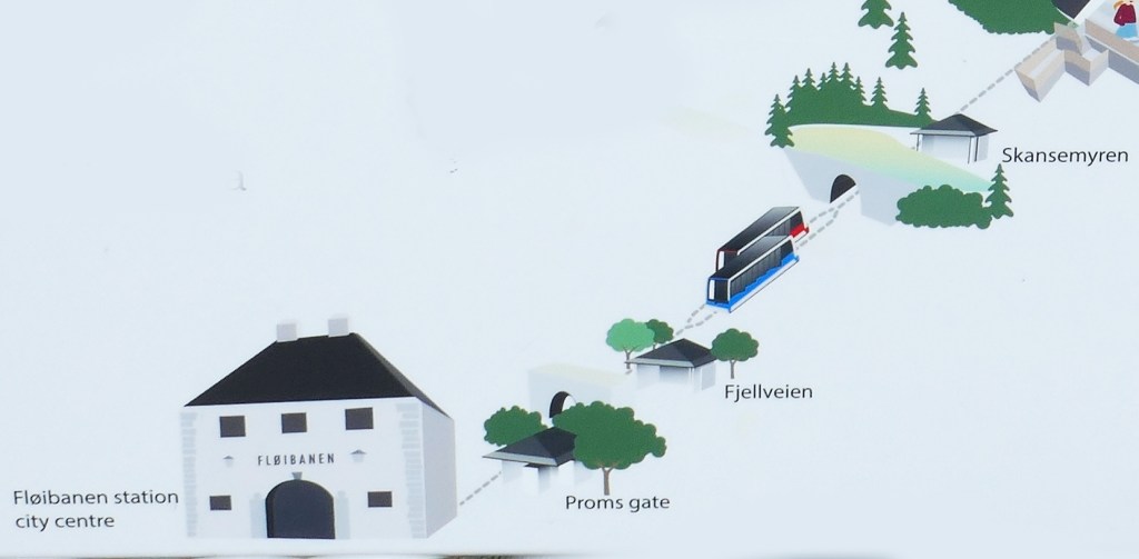 After lunch on Day 2 in Bergen we headed out again with the goal of finding the Funicular Station and catching a ride up the slope of Mt Floyen that loomed over the city. It was a fairly short walk up the hill from the fish market to the Floibanen Station. Given that it was a Sunday, we shouldn’t have been surprised that it was a very popular place to go for both locals and tourists alike and the queue for buying a ticket was fairly long. However we were soon motoring up the hill with a grand view over the city for much of the way.