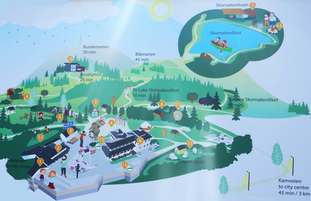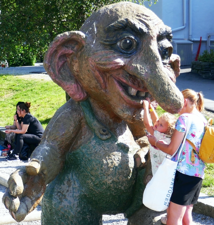 As can be seen from the map of the area on top of Mt Floyen, it is a fun park designed for everybody, but particularly the local hikers who have lots of forest walks as well as the privilege of skipping the Funicular and walking the 3 Km back down the hill to Bergen City; apparently it only take 45 minutes! We also encountered our first statue of a smiling troll, a feature of almost every town we visited in Norway!
