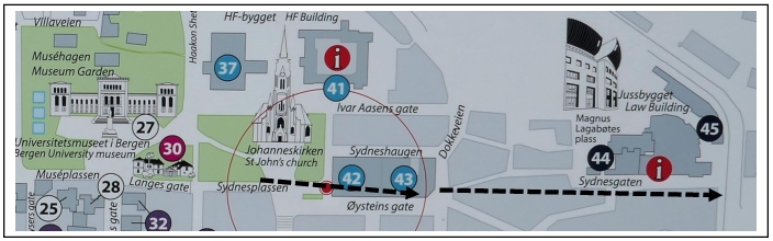 The area around Johannes Kirk is very much a university area, with plenty of associated buildings nearby. We had decided that it would be a good idea to find out what dock our Hurtigruten boat would be leaving from tomorrow afternoon, so our next destination was the dock area. Just outside the church grounds there was a very clear map that showed us that if we walked down hill past many of the university buildings, we would eventually encounter the dock area we were looking for.