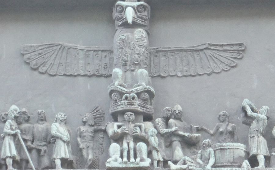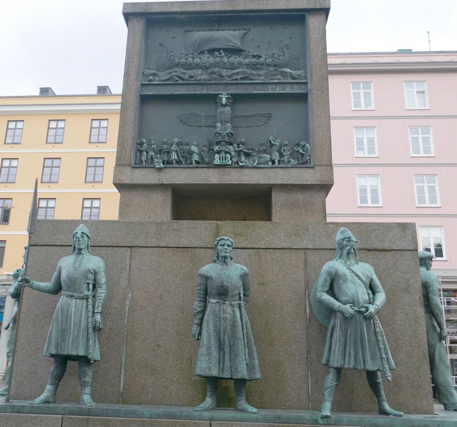 The reference in the above quote to “exclusively male” and “sculptured idealisation” indicate that the author has a number of issues with the message of the monument about Bergen’s past relationship with seafaring, a debate I am happy to leave with the Norwegians. I did find the large and complex monument quite interesting and the sculptural work involved very impressive. Above can be seen two sides of the monument, the image on the left illustrating the Viking Era. It portrays a possible encounter between Leif Ericson and his Viking colleagues when they presumably met some of the natives North America over a 1000 years ago.