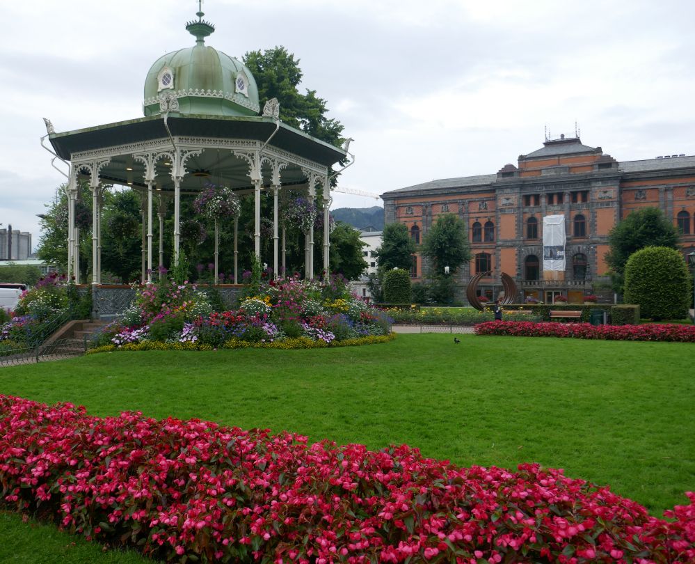 My next early morning destination was the city end of the octagonal lake that we had visited on our walk the previous day, Lille Lungegandsvann. Again, I had recalled the view down this direction after we had left the Bergen train station and I decided it looked a promising place for photos. After walking up half of Torgallmenningen, I turned left down Starvhusgaten and this led me to the parkland at the city end of the lake; Festplassen. This area of parkland is graced by an octagonal gazebo surrounded by gorgeous flower beds. In the background (above left) is one of the many Art Galleries in this area of Bergen, the West Norway Museum of Decorative Art. Further northward from the Gazebo there is a statue of one of Norway’s musical heroes, Edvard Grieg. Despite mainly a diet of American Rock and roll music as a young adult, for some odd reason an LP of Grieg’s wonderful music appeared in my record collection; his “Hall of the Mountain King” was a great favourite. Having a love for this tune probably spoilt my appreciation of all the plaster trolls I encountered as we travelled Norway! I wasn’t to know at this point of the walk I would encounter another statue up the hill of another of Norway’s literary heroes, Henrik Ibsen. Greig had written the incidental music for this famous Norwegian’s play, ‘Peer Gynt’. The music is almost as famous as the play.