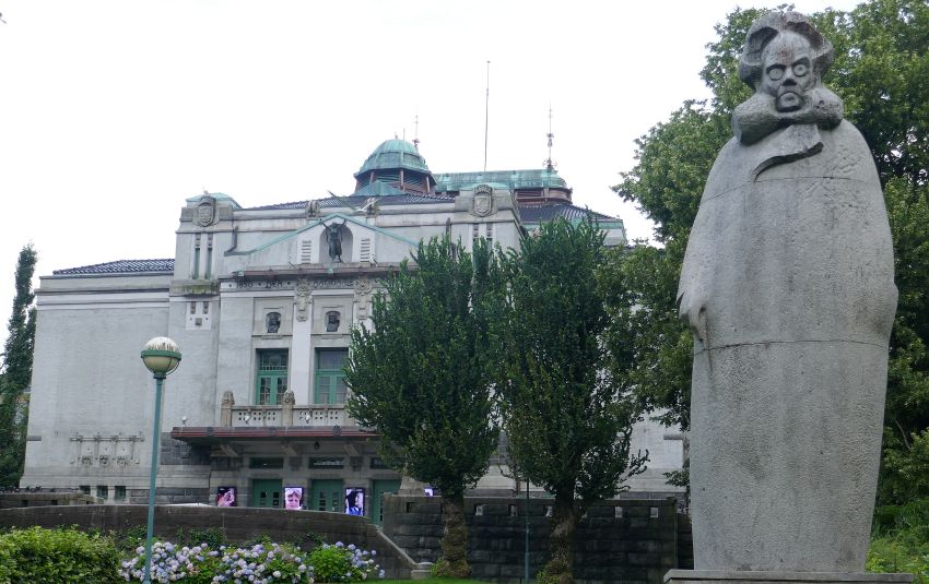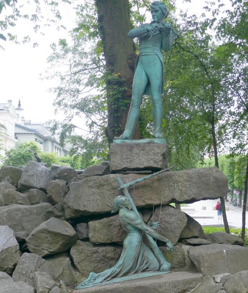Crossing the road and heading west, I arrived at the start of Ole Bulls plass which is a street that goes all the way up the hill to meet the grounds that surround, Bergen’s major playhouse, ‘The National Stage’. It is a broad street at its starting point and has a long park that runs down its centre, separating the traffic lanes of the street. Just over the road from Festplassen, there is a grove of trees that surrounds an impressive statue of Ole Bull (1810-1880), the Norwegian virtuoso violinist and composer…he was considered in his day on a level with the Italian Nicolo Paganini (1782-1840), the most celebrated violin virtuoso of his time. The statue in this park was created by Stefan Sinding and unveiled in 1901. It fell down in 1997 but was repaired and reinstalled in 1998.