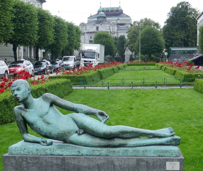 A little further up this park in the centre of Ole Bull Plass is another statue (right, above) called the ‘Lying Poet”. It was created by Hans Jacob Myer and installed here in 1958. The model for the sculpture was the painter Laurie Grundt (1923-2020).