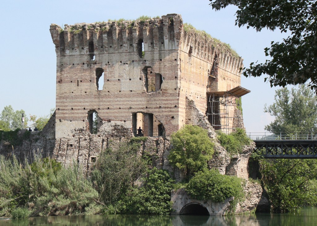 Our guides decided that our first stop for the morning was just a little outside of Borghetto at Ponte Visconte, an unusual multi-purpose structure that was built as a bridge, a dam over the Mincio River and as a fortification. It was built by Gian Visconti, the Duke of Milan (1351-1402), in 1393 as part of his plan to take over the major cities of Northern Italy. Visconti was an ambitious medieval ruler who wasn’t put off by the fact that his territory was caught between the ambitious Kings of France and the Holy Roman Empire on the other side.