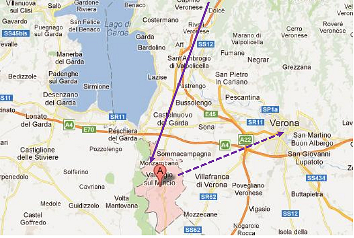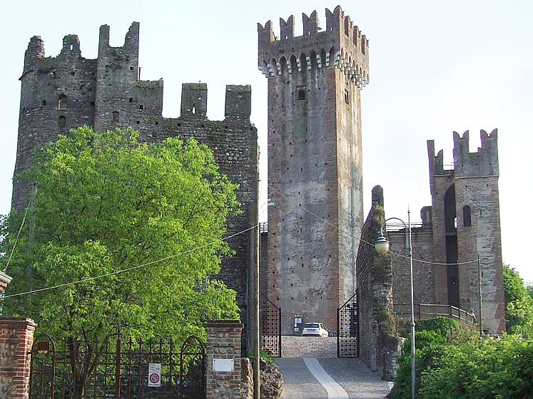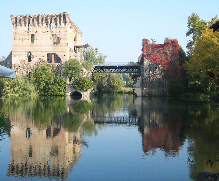 In our inspection of this very old medieval bridge, we couldn’t help but notice that it was connected by fortified walls that led all the way up the hill to the neighbouring town of Valeggio. Dominating the skyline was an impressive castle. I was delighted to discover that this was yet another Scaligeri Family castle, the fifth fortress of this ambitious 13/14th century Veronese family that we had encountered on our wanderings around the Veneto Region. This spot was in ancient times the best ford across the Mincio River and in the Middle Ages, part of the border with the Holy Roman Empire. The fortified walls (the Scaligeri Serraglio) that made their way up the valley to the castle on the hill were also built by the de Scala family. Today there is an arduous walk that we could have done leading up to the castle but time wasn’t on our side. We had to be satisfied with inspecting the bridge that was built as an extension of these fortifications when the Visconti’s of Milan pushed out the Scaligeri Rulers of Verona.