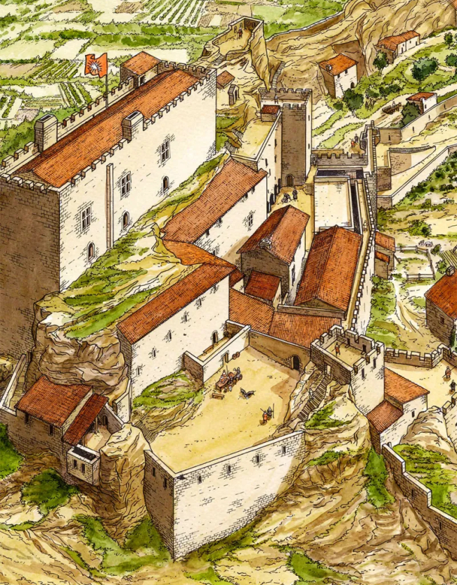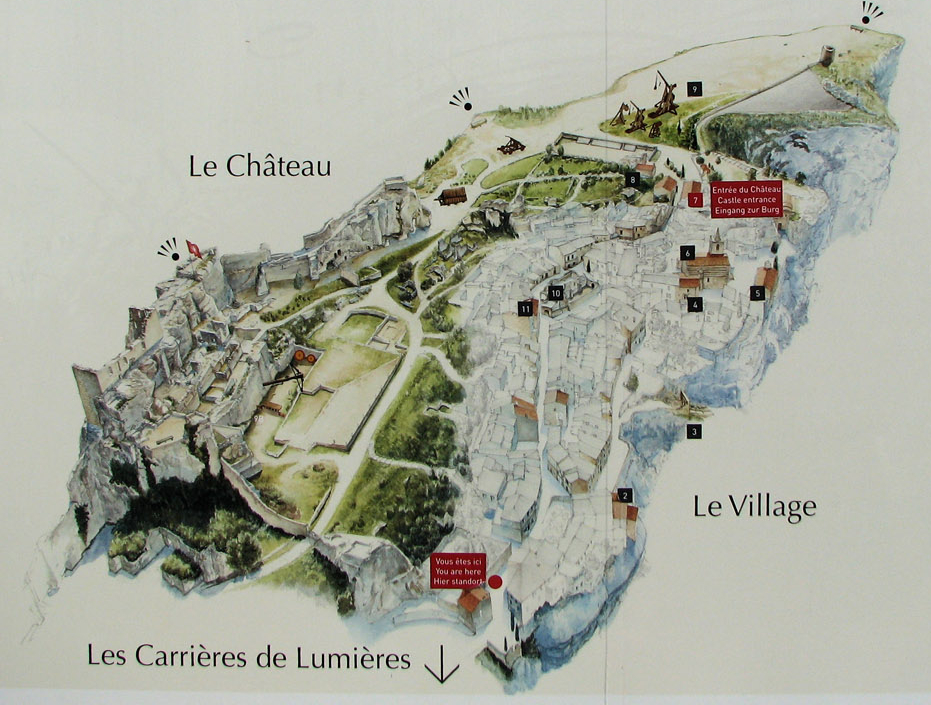 Because of the nature of the rising landscape on which the Baux castle was built, it is clear that the original builders couldn’t construct a standard castle. This fortress had to be merged with the rock of the towering mountain. Each section of the castle had to be built into the rock face at different levels where a platform could be carved out of the bed-rock. When the castle was destroyed in the 17th century, it looks like Cardinal Richelieu’s forces merely knocked down the castle walls on one side of the fortress, leaving the other walls standing, helpless to exclude any future invaders. Another helpful, illustrative diagram from the Baux castle site (on right below) shows what the original buildings might have looked like before losing key walls.