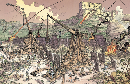 The entry to the castle section of Les Baux is at the other end of the village where you immediately get great views out over Les Alpilles. Before beginning the climb up to the castle battlements, the visitor can inspect on this area of the plateau where examples of medieval war machines such as the Trebucet are placed, illustrating what the castle defenders could use to lob rocks, fire or dead animals down on troops approaching the castle from either side of the mountain. Scattered around the village and the castle are interpretative diagrams of what life in the castle was like in the Middle Ages. The image on the left from the site gives a graphic indication of what the use of the Trebucets might have looked like.