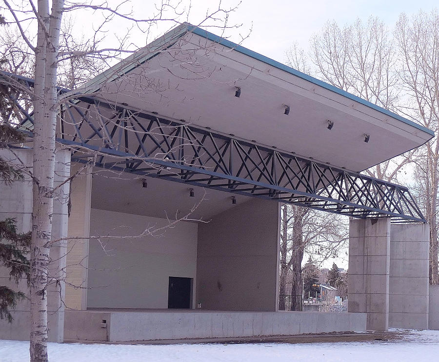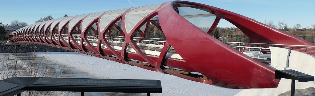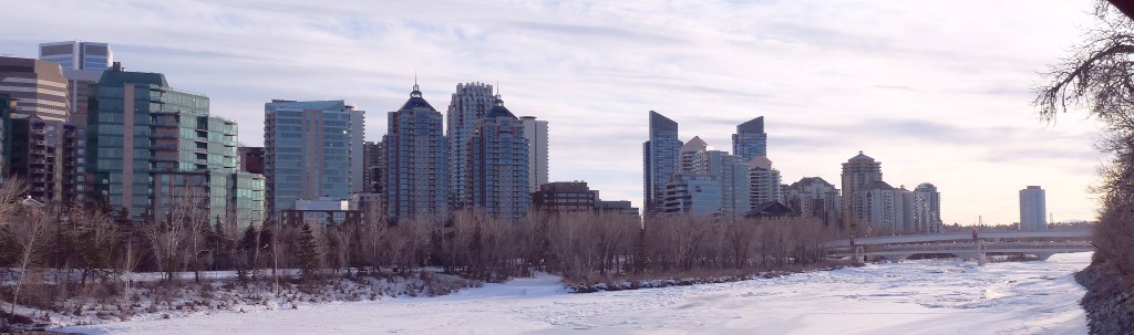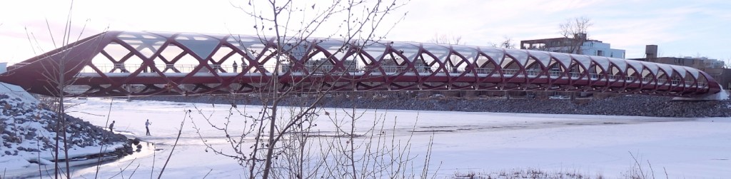 The photo below of the Peace Bridge taken from the end of Prince’s Island illustrates that despite the declining of the afternoon light, the bridge still looks like a marvel. I was a little surprised to see under the bridge two teenagers walking out on the ice that covered the river. I wondered how many folk like this disappeared through shallow ice in Calgary’s winter.