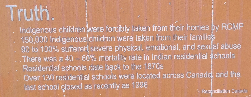 I was able to walk onto Prince’s Island and a path took me back to the end of the island with a great view back to the Peace Bridge. The photo on the left below is of the end of Prince’s Island from the end of the peace bridge. When I got to this point on the island, there were some significant posters. One of these posters told the story of two Calgarians who promoted the construction of trails for citizens. The image on the right above is of a poster about the issues involved in the Indigenous Children’s schools that I had read about out the front of the Calgary Town Hall earlier this morning.